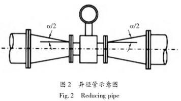(12)當(dāng)管道內(nèi)流速偏低,工藝流量又較穩(wěn)定,為滿足儀表對(duì)流速范圍的要求,在儀表部分局部提報(bào)流速,可選擇流量計(jì)口徑小于工藝管道,并在流量計(jì)的前后加接異徑管。為了在安裝異徑管后不過(guò)多影響流場(chǎng)分布,不影響污水流量計(jì)的精度,要求異徑管的中心錐角α不大于15°,越小越好。這樣可把異徑管視為直管段的一部分。