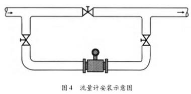 (6)安裝在工藝不允許流量中斷的管道時(shí),應(yīng)考慮儀表的清洗和維護(hù),應(yīng)安裝旁通管道(如圖4)。