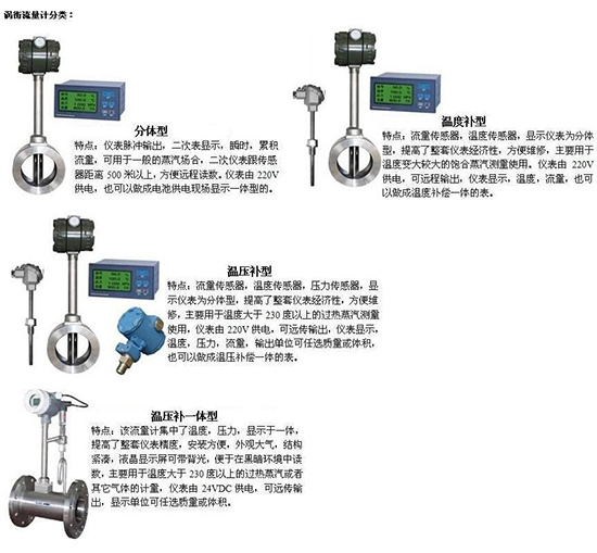 渦街流量計與現場顯示儀組合后,成為智能一體化流量計,分別用于飽和蒸汽流量計量、過熱蒸汽流量計量、各種化學氣體流量計量和各種液體流量計量。