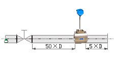流量調節閥或壓力調節閥盡量安裝在傳感器的下游5D以遠處,若必須安裝在傳感器的上游,傳感器上游應有不小于50D的等徑直管段,下游應有不小于5D的等徑直管段。