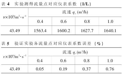 為證明該高粘度變流速自適應算法及公式的有效性,重新選取四個流量點:0.4m3/h、0.6m3/h、0.8m3/h、1.0m3/h對該公式以及算法進行精度驗證,得到表4數據,表5為各對應流量點的擬合后儀表系數的誤差。