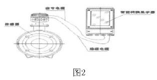 一體型管道污水流量計是由流量傳感器和轉換器(也叫顯示器)兩大部分組成。測量管上下裝有激磁線圈,通激磁電流后產生磁場穿過測量管,一對電極裝在測量管內壁與液體相接觸,引出感應電勢,送到轉換器。激磁電流則由轉換器提供。如圖2所示: