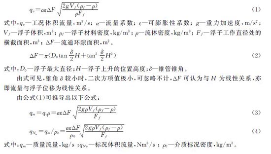 流量計垂直安裝在管道上,流體自下向上流經錐管,浮子在P1、P2差壓作用下產生上升或下移,當浮子此差壓(P2-P1)與浮子重力G、浮力F、粘滯力合力平衡時,處于平衡狀態。建立方程并推導(可參考相關專業資料,此處省略),忽略粘滯力影響,假設流量系數為常數,可得出浮子位移與流量成線性對應關系。浮子流量計的流量方程為: