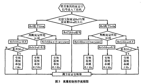 實際生產中流量一直在某個區域內波動,且其動態特性不易掌握。從上面的理論中我們能夠讓誤差△£盡可能的小,這樣距我們所需要的理論值%就越接近。而減小誤差需要我們把n取的盡可能大,也就是在生產時間內劃分更多的周期去調節流量。當工控機根據排污計量表傳送回來的信號發出調節變頻器工作頻率的指令后,電機調整功率到排污計量表的實際測量為一個工作周期,我們知道從指令發送到實際測量值返回有一個較大的滯后,如果調節的周期時間小于流量計本身的一個工作周期,那么顯然不可能達到減小誤差的目的。利用模糊控制思想H。,在控制程序中我們把流量的波動區域劃分為±缸×Yo,Yo-t-O.3,Yo±0.5四個區域,其中缸為可調節的誤差范圍,生產中我們取0.015,流量區域劃分的單位均為t/h。針對不同的區域采取不同的調整方案。具體流程如圖3所示。圖中變量Rel表示實際測量的流量,變量Idea表示理論流量。