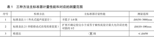 本規范包含三種校準方法,分別為標準表法 1(外夾式超聲流量計)、標準表法 2(串聯移動式在線校準裝置)和稱重法,編制組對每種方法進行了大量的實驗,并積極與智能電磁流量計生產廠家及用戶溝通探討,積累了豐富的經驗,獲得了大量的實驗數據,*終確定三種方法的主標準器計量性能和對應的測量范圍,如表 1 所示。