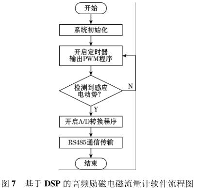 軟件流程圖如圖7 所示。軟件采用模塊化的設(shè)計(jì)方法,主要設(shè)計(jì)了勵(lì)磁控制切換程序、PWM 波產(chǎn)生程序、A/D 轉(zhuǎn)換程序以及 RS485 通信程序等。系統(tǒng)上電后*先執(zhí)行復(fù)位操作,利用 DSP 內(nèi)部的定時(shí)器產(chǎn)生PWM 波控制 H 橋電路中的勵(lì)磁方式,當(dāng)系統(tǒng)檢測到傳感器線圈輸出的感應(yīng)電動(dòng)勢后,利用 DSP 內(nèi)部的 12位 A/D 轉(zhuǎn)換器對此信號(hào)進(jìn)行模數(shù)轉(zhuǎn)換,*后根據(jù)相應(yīng)算法計(jì)算出管道中被測液體的流量。