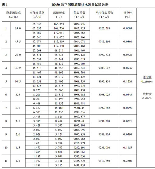 將本文實現的數字煙氣流量計在上述 50mm 口 徑( 簡稱 DN50) 的水流量試驗裝置上進行試驗。先在其正常流量范圍內進行試驗,流量從大到小逐漸降低,之后不斷探求其所能測量的*小流量。每個流量點試驗三次,計算其重復性、平均儀表系數和線性度。水流量試驗數據如表 1 所示。