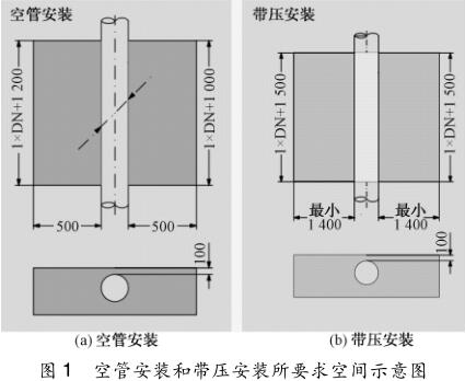 (1)要確認在用液體電磁流量計的管壁厚度及內襯材料特性,保證換能器在管段內壁的突出長度;(2)用氣焊切割液體電磁流量計外殼時,一定要在管道內充滿水的情況下(*好是帶壓并繼續保持管內水在運行流動的狀態)進行,以免內襯受熱凸起變形影響流態;(3)要有足夠安裝空間(流量井),可以用原有的流量井,但管壁與流量井墻壁*小距離不小于 500 mm,流量井長不小于 1. 5 倍管徑。超聲波流量計空管安裝和帶壓安裝要求空間如圖 1 所示。