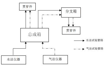 安全殼高溫蒸汽流量計(jì)以總成箱和分支箱為核心。試驗(yàn)初期,將總成箱置于儀器放置區(qū),分支箱置于貫穿件集中區(qū)域附近,檢漏儀至總成箱再至分支箱之間的管線固定連接,如圖2所示。水法試驗(yàn)管路與氣法試驗(yàn)管路互相獨(dú)立,總成箱和分支箱的每一路連接采用編號(hào)標(biāo)記進(jìn)行區(qū)分,并設(shè)置控制閥控制開(kāi)關(guān)和流向。