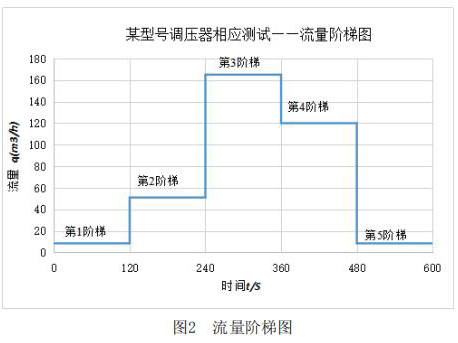 該測試主要利用實驗室測試條件,模擬客戶現場使用情況。其主要測試內容包括:測試分體式電磁流量計在+23℃,-30℃和-40℃三種溫度下,分體式電磁流量計出口壓力分別在2.1kPa和30kPa時,流量分別從*1階梯到*5階梯時的響應速度,客戶所提供的流量階梯如圖2所示。橫軸表示下游球閥開啟動作時間,縱軸表示分體式電磁流量計下游需要的流量q。