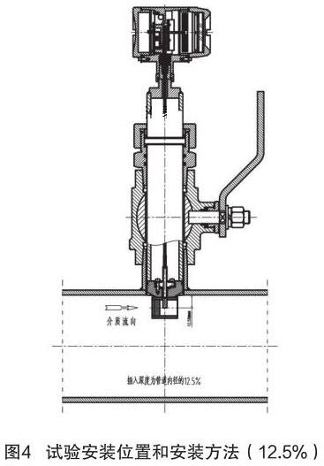 根據中華人民共和國機械行業標準:JB/T9249-2015《流量計》進行煙氣流量計的研制與設計。在試驗過程中,因為理論研究不充分,再加上經驗不足,采用插入深度是按照以往其它產品(插入式電磁流量計)的經驗,以插入深度為現場管道內徑的 12.5% 進行試驗,其對介質流量的檢測值與同種規格管道法蘭式結構的流量計進行比較,偏差值較大、儀表準確度無法滿足設計要求。試驗安裝位置和安裝方法如圖 4 所示。