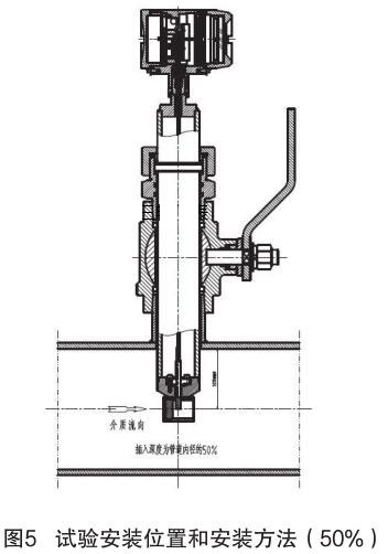 對插入式渦街流量計和插入式電磁流量計的結構原理進行分析,插入式電磁流量計的信號采集點在標校管道內12.5% 為宜,因它屬電磁類流量計,而流量計是根據“卡門渦街”原理進行測量管道內流量,根據標校管道內層流和湍流的分析,以及流量計獨特的探頭結構形式,確定煙氣流量計的插入深度為標校管道內 50%,試驗安裝位置和安裝方法如圖 5 所示。