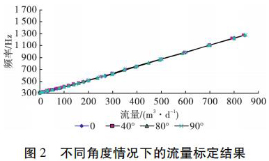 為了考察井眼斜度變化對電磁流量計測量流量的影響,開展了非集流高壓電磁流量計在不同斜度情況下的流量測量模擬實驗。模擬實驗在大慶油田多相流實驗室進行,儀器外徑 38 mm,模擬井筒內徑為 124 mm,實驗介質是水,傾斜角度分別為 0°、40°、80°和 90°( 水平) ,流量范圍為 5 ~ 850 m3 /d。實驗結果表明,在儀器居中條件下,井眼斜度變化對電磁流量計的儀表常數(shù)沒有影響,滿量程誤差不大于 4% ,因此可以應用高壓電磁流量計進行水平井注水剖面測量。不同角度情況下的實驗結果如圖 2 所示。