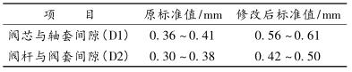 3)將原閥桿、閥芯的外徑尺寸減小,使閥芯與閥套配合間隙(D1)、閥桿與閥套配合間隙(D2)增大,減小其卡澀的可能性,具體數(shù)據(jù)如表2。