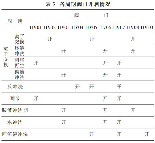 5)回流沖洗周期。 胺液每天都需取樣化驗,如果發現胺液中有不溶或懸浮的過渡金屬聚集,則每天運行周期結束后需利用回流液對樹脂進行清洗,以防止腐蝕和樹脂損壞。 如果選擇了此選項,PLC程序會在每天完成目標數量的離子交換周期后,自動執行回流液清洗周期。 各周期閥門對應開關情況,如表 2 所示。