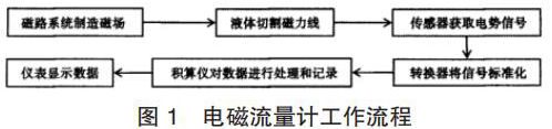 智能渦輪流量計(jì)的產(chǎn)生主要是基于法拉*電磁感應(yīng)定律。在智能渦輪流量計(jì)的應(yīng)用中,磁路系統(tǒng)會(huì)在流量計(jì)運(yùn)行過程中逐步出現(xiàn)直流磁場(chǎng)與交流磁場(chǎng),該磁場(chǎng)的產(chǎn)生為后期的測(cè)量提供了良好的前提條件,營(yíng)造了測(cè)量所需的磁場(chǎng)環(huán)境,因此,在智能渦輪流量計(jì)應(yīng)用時(shí),一旦被測(cè)液體在導(dǎo)管中經(jīng)過該磁場(chǎng)環(huán)境時(shí),必然會(huì)產(chǎn)生一定的切割磁力線運(yùn)動(dòng),在這種情況下,電極傳感器就會(huì)發(fā)揮其作用,將導(dǎo)管內(nèi)的流量轉(zhuǎn)換為感應(yīng)電勢(shì)信號(hào),隨后此轉(zhuǎn)換形成的信號(hào)逐步被傳遞給轉(zhuǎn)換器。而轉(zhuǎn)換器更是可以將所獲得的流量信號(hào)等加以處理,通過分析、對(duì)比等,轉(zhuǎn)換器會(huì)將該信號(hào)變?yōu)闃?biāo)準(zhǔn)信號(hào),隨后將該信號(hào)輸出給積算儀,進(jìn)一步進(jìn)行信號(hào)的處理,這些處理以后的信號(hào)*終會(huì)在智能渦輪流量計(jì)的儀表中顯示,呈現(xiàn)*終的流量測(cè)量結(jié)果,其基本的流程如圖 1 所示。