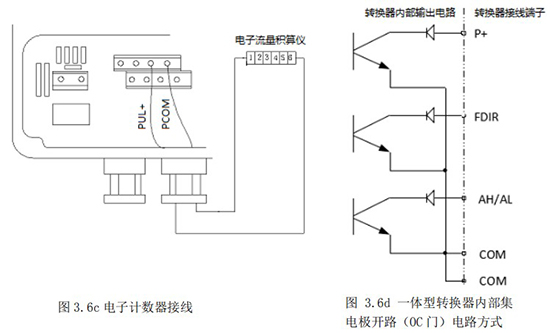 3.4.5 頻率(脈沖)、上下限報警、流向標示等輸出均為集電極開路的電平輸出信號。