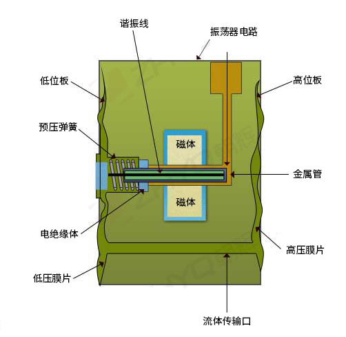 由磁場驅(qū)動的振蕩器電路會導(dǎo)致導(dǎo)線以其共振頻率振蕩。導(dǎo)線的一側(cè)牢固地固定到靜態(tài)部件,而另一側(cè)則連接到膜片。彈簧使電線預(yù)緊。由于過程壓力對隔膜的影響,金屬絲將在壓力升高時(shí)拉伸,而在壓力降低時(shí)收縮。共振頻率將相應(yīng)地增加或減少。數(shù)字計(jì)數(shù)器測量諧振頻率的變化,并將其信號傳遞給微芯片,該微芯片還處理線性化補(bǔ)償和溫度補(bǔ)償。
