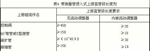 2) 浸入式 帶測量管的浸入式流量傳感器和插入式儀表需要一定長度前置直管段,iso/dis 14511對此未作具體規(guī)定,而按制造廠建議的值。bs 7405建議對于在管道中用插入熱絲流速計時,需要(8~10)d的上游直管段和(3~5)d的下游直管段。表4列舉sierra公司對帶測量管浸入式tmf所規(guī)定的上直管段長度;若在其進(jìn)口端裝一塊或二快多孔板式流動調(diào)整器(整流器)后,則其長度可大為縮短,如表*右列所示。