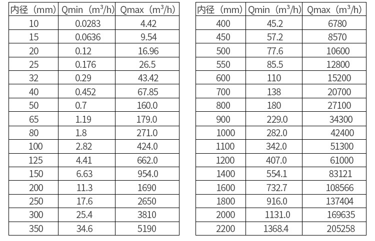 您可以根據自身工藝管道的實際流量對應上表中的流量來選擇相應口徑規格的流量計,盡可能選擇與工藝管道相同口徑規格的流量計。