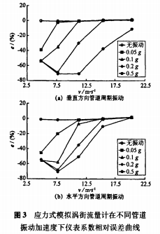 為了對比不同方向管道振動(dòng)對渦街流量計(jì)測量的影響,將管道振動(dòng)改為水平方向重新進(jìn)行試驗(yàn),得到圖3(b)曲線。通過與圖3(a)比較,發(fā)現(xiàn)兩種情況下流速及振動(dòng)加速度對儀表系數(shù)相對誤差的影響趨勢類似。依據(jù)先前擬定的抗振標(biāo)準(zhǔn),應(yīng)力式模擬