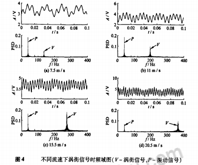 為了觀測管道周期振動(dòng)下渦街流量信號的特征,利用NI USB-6009數(shù)據(jù)采集卡對渦街正弦信號進(jìn)行采樣。以垂直方向管道振動(dòng)加速度為0.1g為例,給出了不同流速下渦街信號的時(shí)頻域圖,如圖4所示。由時(shí)域部分可知,管道振動(dòng)下渦街流量傳感器輸出的信號為真實(shí)旋渦脫落信號和管道振動(dòng)信號的合成信號。低流速(≤1lm/s)時(shí),管道振動(dòng)信號強(qiáng)、占主要成分,渦街信號疊加在其上;隨著流速變大(11~20.5m/s),渦街信號逐漸顯露出來成為主要成分、淹沒振動(dòng)信號。由頻域可知,振動(dòng)信號成分較單一,呈尖峰狀,幅值為定值,不隨流速變化而變,除40Hz基頻外還有2、3倍頻出現(xiàn);而渦街信號成分稍復(fù)雜,呈塔峰狀,幅值隨流速變大而迅速增強(qiáng),頻譜能量占總能量比重也隨流速增加而變大。