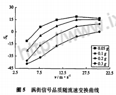 圖5給出了不同管道振動(dòng)加速度下渦街信號品質(zhì)隨流速變化的情況。不論振動(dòng)加速度如何變換,Sq的變化趨勢都是隨著流速的增加而變大,但Sq何時(shí)由負(fù)變正,則與振動(dòng)加速度密切相關(guān)。相同流速下,管道振動(dòng)加速度越大,Sq值越小,渦街信號品質(zhì)越差。Sq小于零時(shí),表明由振動(dòng)引起的其他頻帶能量大于渦街頻帶能量,且Sq絕對值越大,渦街信號品質(zhì)越差,渦街流量計(jì)的測量誤差越大;Sq大于零時(shí),表明渦街頻率帶的能量大于其它頻帶的能量,管道振動(dòng)對渦街信號影響較小,且Sq值越大,渦街信號品質(zhì)越好,渦街流量計(jì)的測量誤差越小。這也與圖3(a)得到的試驗(yàn)結(jié)果完全吻合。