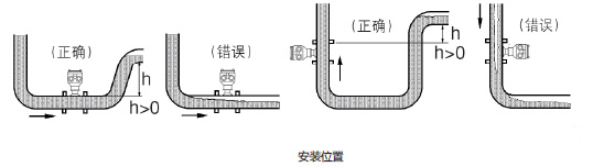 ⑴為了避免由夾附氣體引起的測量誤差,請觀察如下安裝方法:見圖-1,錯誤安裝—裝在管線走向*高點(在測量中容易聚集空氣泡)。