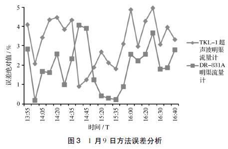 見圖3,以手工實(shí)測(cè)液位高度為基準(zhǔn),2種流量計(jì)的誤差均在±5%的范圍內(nèi)。除在1月9日14:40和14:45兩個(gè)時(shí)間點(diǎn)測(cè)量值表現(xiàn)出DR-831A測(cè)量誤差高于TKL-Ⅰ外,其他時(shí)段都明顯表現(xiàn)出DR-831A測(cè)量誤差小于TKL-Ⅰ。