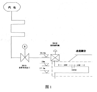 異形孔板安裝在鍋爐30米處連排管段,截去一段加裝U形管段的來流直管段上,根據(jù)安裝要求,測點位置選在距離上游直管段1810mm,距離下游直管段1085mm處。符合“距離上游直管段>10D(D=56mm,管道內(nèi)徑),距離下游直管段>5D”的要求??装宓娜汗転榇怪毕蛳?,圓缺孔板的弦與管道橫截面水平中心線平行安裝。其改造安裝圖如圖1所示。